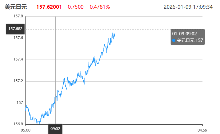 2026年1月9日亚洲早盘,美元兑日元呈现高位震荡态势,现报157.11,上一交易日收于156.95,日内微涨0.1530%,盘中最高触及157.13,最低下探156.80,整体波动幅度有限。当前汇率处于近9个月以来的高位区间,市场在日本财政动态与美联储政策信号明朗前,保持谨慎观望态度。