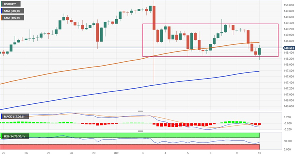 从技术角度来看,美元/日元货币对现在似乎已经在 4 小时图表上的 100 周期简单移动平均线 (SMA) 下方找到了接受点。此外,小时图上的振荡指标仍处于负值区域,但日线图上尚未确认看跌倾向。因此,任何后续下滑更有可能在 148.00 关口附近找到不错的支撑,并在 4 小时图上的 200 周期移动平均线附近保持有限,目前位于 147.70-147.65 区域附近。