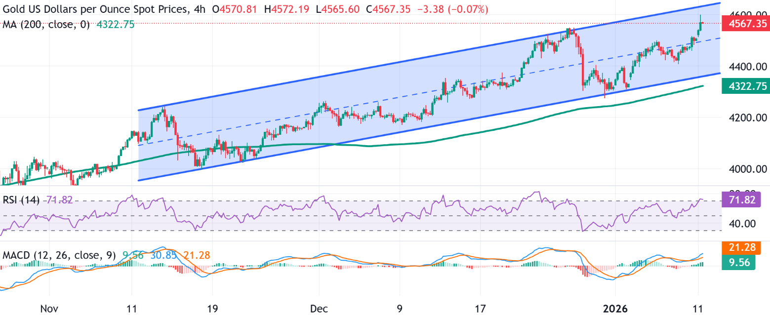 黄金(XAU/USD)连续第三天走高——这也标志着在之前的六天中有五天出现 positive走势——并在周一亚洲时段触及历史新高,接近4600美元的水平。美国对委内瑞拉的入侵、美国总统唐纳德·特朗普对伊朗动乱的军事行动威胁、俄罗斯与乌克兰的战争、中国与日本的争端,以及白宫坚持收购格陵兰,使投资者感到不安。这反过来又对全球风险情绪产生了影响,并继续推动安全避风港的资金流向黄金。