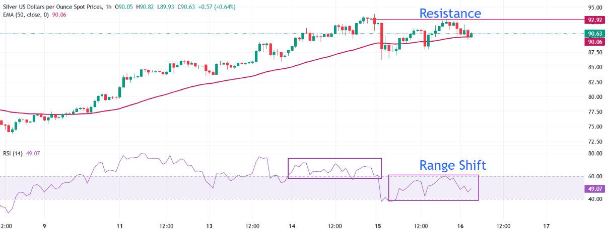 截至撰写时,白银/美元交易价格为 $90.63,处于较低水平。50 小时指数移动平均线(EMA)上升并位于 $90.06,由于价格保持在该线上方,支持了短期上涨趋势。50 小时 EMA 的上升斜率表明趋势跟踪支持正在改善。