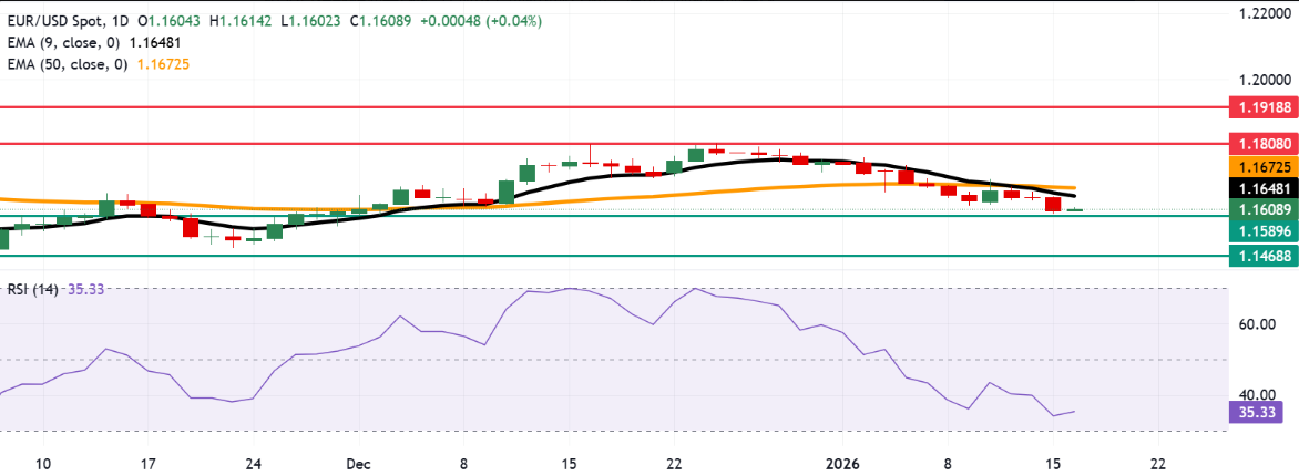 欧元兑美元在连续三天下跌后保持稳定,在周五亚洲时段交易于1.1610附近。14天相对强弱指数(RSI)动量指标目前为35(中性-看跌),显示动量倾向于下跌。