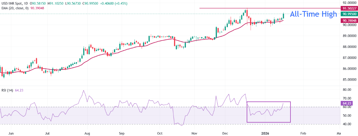 美元/印度卢比截至写作时,已飙升至接近91.15。20天指数移动平均线(EMA)正在上升,并继续支持价格上涨。价格走势保持在这一动态指标之上,限制了回撤。