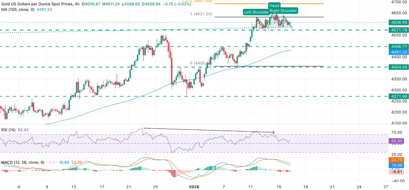 XAU/USD正在形成一个潜在的头肩形态,其 neckline位于$4,570。