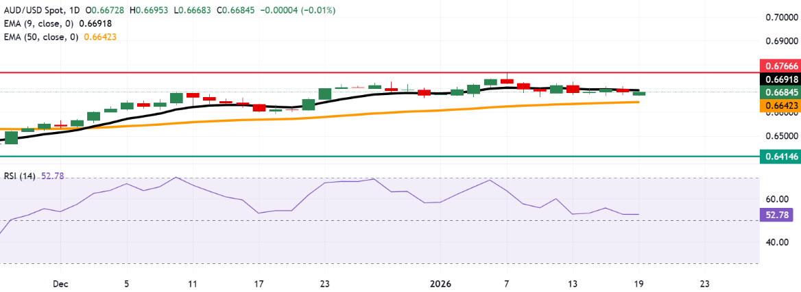 澳元兑美元周一在0.6680附近交易。日线图分析显示,该货币对在九日指数移动平均线(EMA)附近整理,表明短期内有中性偏见。14日相对强弱指数(RSI)为52.78,仍高于中点,支持上涨动力。