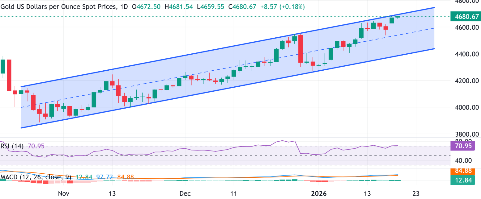 黄金 (XAU/USD) 在$4,700上方的日内突破势头持续,并在周二的欧洲早盘继续创下历史新高。持续的俄罗斯-乌克兰战争使地缘政治风险保持在高位,并抵消了伊朗国内骚乱的平息,这减少了美国干预的可能性。此外,关于美国和欧洲之间可能的贸易战的担忧,以及因格兰兰问题加剧的紧张局势,继续影响投资者情绪,并对作为避险资产的贵金属提供支撑。