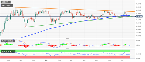 从更广泛的角度来看,自 2022 年 10 月以来,美元/印度卢比货币对一直在两条聚合趋势线之间振荡。这在日线图上形成了对称三角形,标志着下一个方向走势之前的盘整阶段。与此同时,低于技术上重要的移动平均线的接受有利于看跌交易者,并支持最终崩溃的前景。