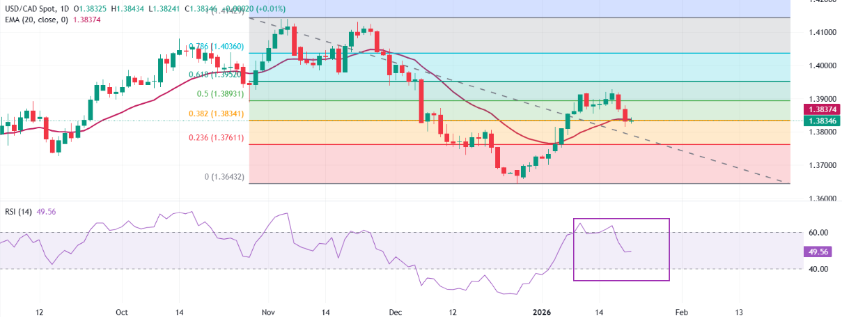 USD/CAD 在撰写时围绕1.3834进行横盘整理。20期指数移动平均线(EMA)在持续下跌后已趋于平稳,接近1.3837,并略高于现货水平,限制了反弹。如果收盘价高于20日EMA,将改善短期走势,而未能重新夺回该位置将使价格走势仍然低迷。