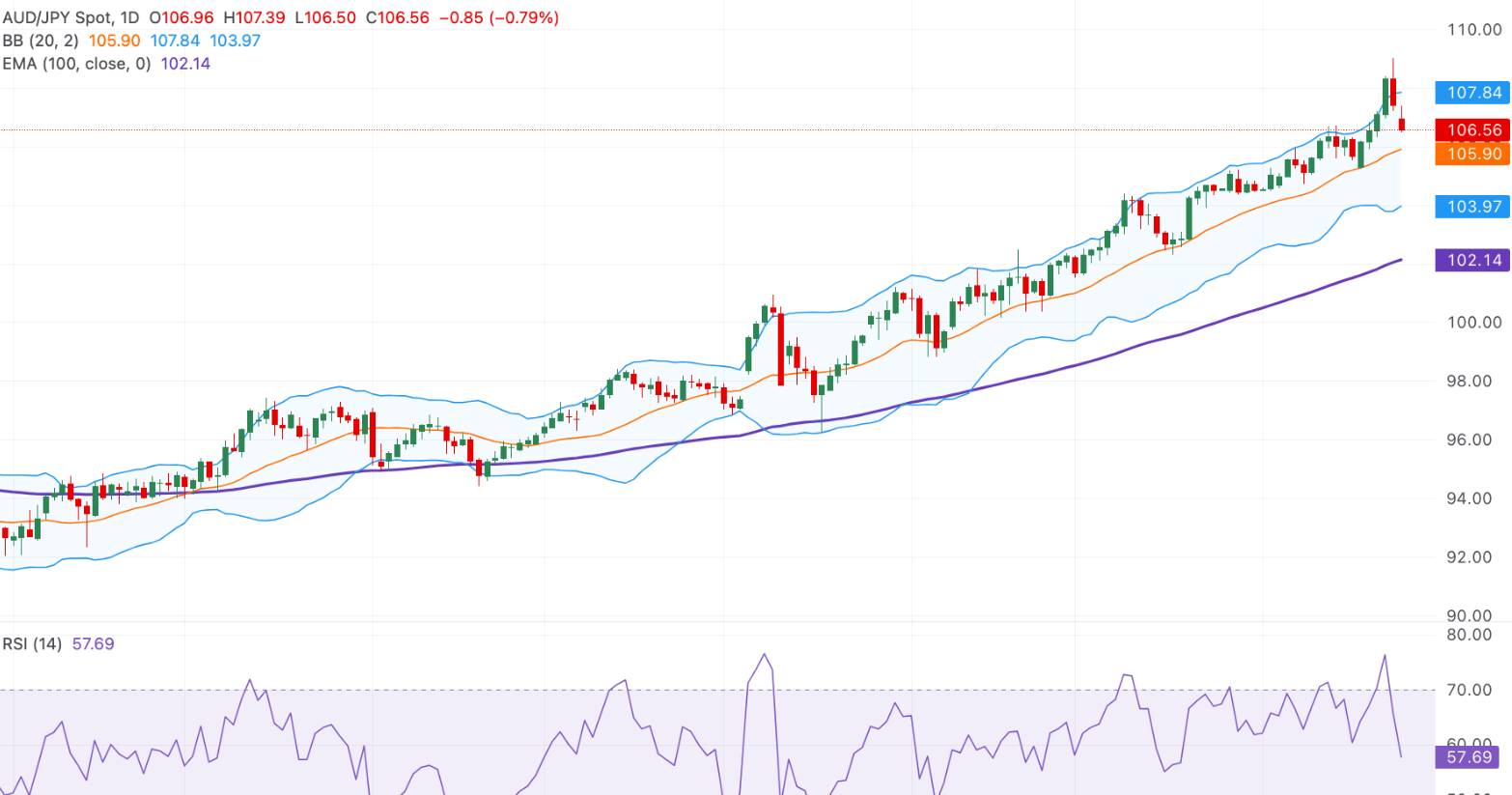 在日线图上,澳元兑日元(AUD/JPY)保持在100日指数移动平均线(EMA)上方102.14,其上升斜率支持了坚定的看涨 bias。与该平均值的距离强调了趋势强度,同时标志着动态支撑位。RSI(相对强弱指数)为57.69,已从之前的超值读数中有所缓解,但仍保持在50线上方,保留了积极的动量。价格在布林线的上半部分交易,带宽适度扩大,表明持续的买盘压力;中间线在105.90提供支撑,而上线在107.85限制了短期顶部。