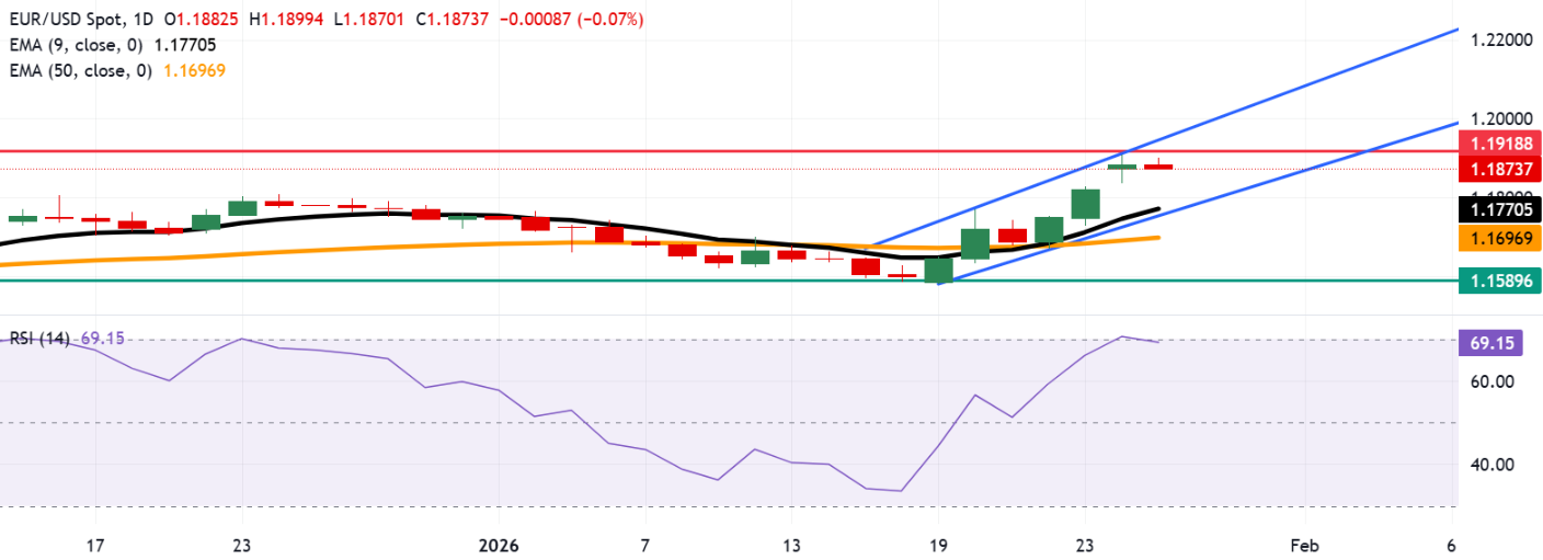 欧元兑美元在连续三天上涨后有所下跌,在周二的亚洲时段交易于1.1870附近。日线图的技术分析显示,该货币对在上升通道内上涨,表明存在持续的看涨趋势。