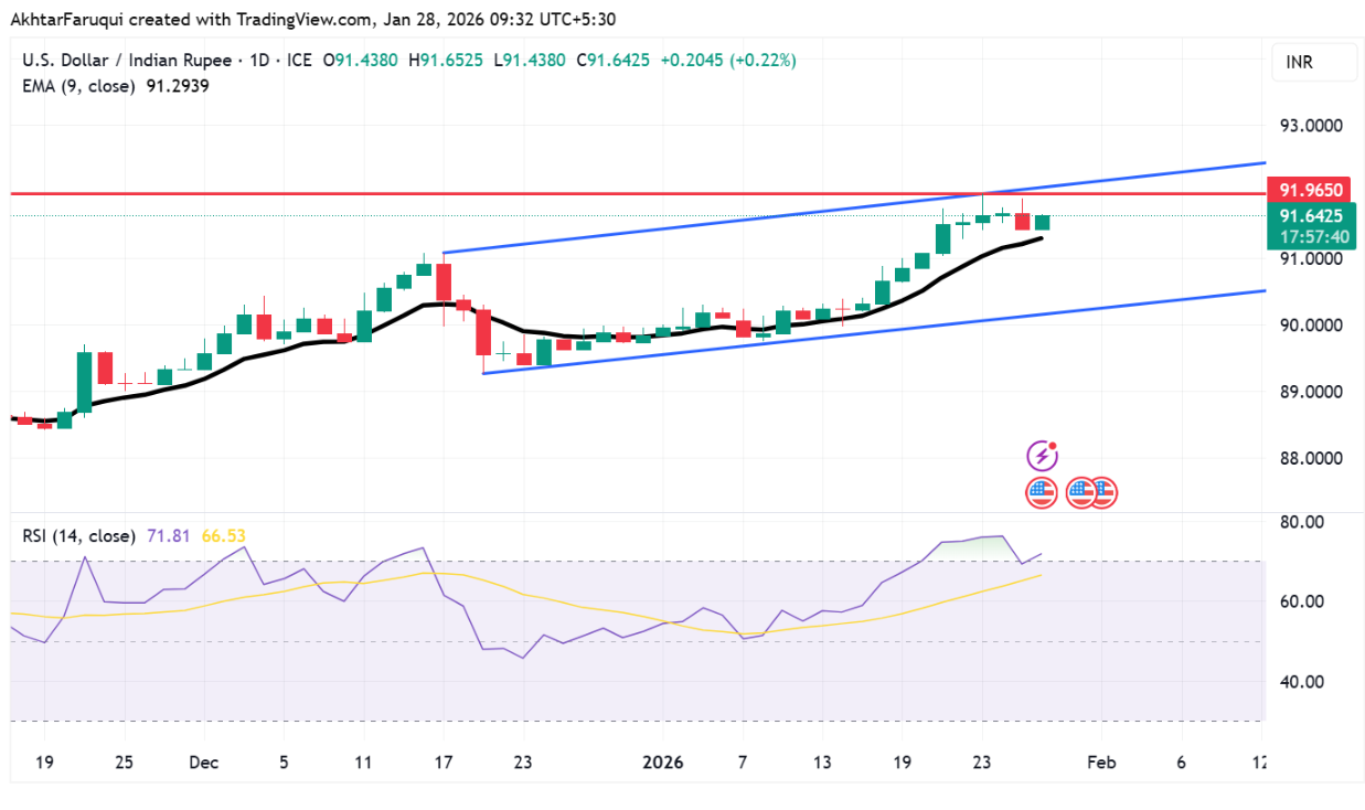 在1月23日的历史新高91.96附近立即遇到阻力,随后是接近92.10的上升通道上边界。下方方面,91.29的九日EMA作为初步支撑,而其下方可能会暴露出90.20附近的下通道支撑。