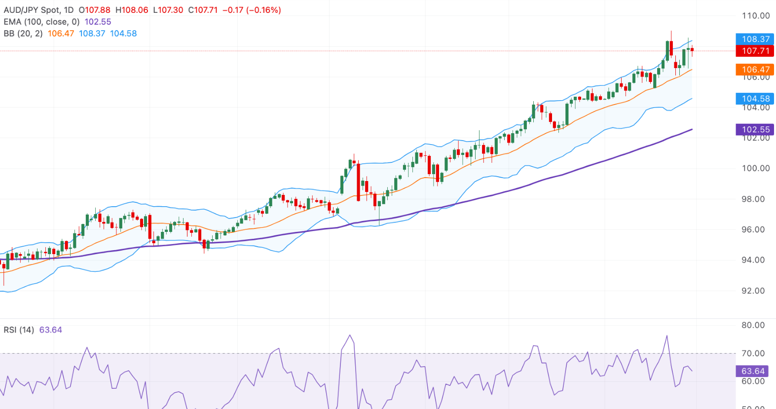 在日线图上,澳元兑日元(AUD/JPY)明显高于上升的20日简单移动平均线(SMA)和100日指数移动平均线(EMA),表明多头趋势已经巩固。这两个平均线的斜率都在上升,确认了向上的趋势,并提供了动态支持。RSI(相对强弱指数)在63.64的正值区域,从之前的超买水平有所缓解,显示出强劲但有所缓解的动量。即时阻力出现在上部布林带上轨108.35,而第一个支撑位与中间线106.45对齐。如果日线收盘价突破阻力位,可能会延续上涨趋势;但如果在该阻力位暂停,可能会有利于向中间线回撤。
