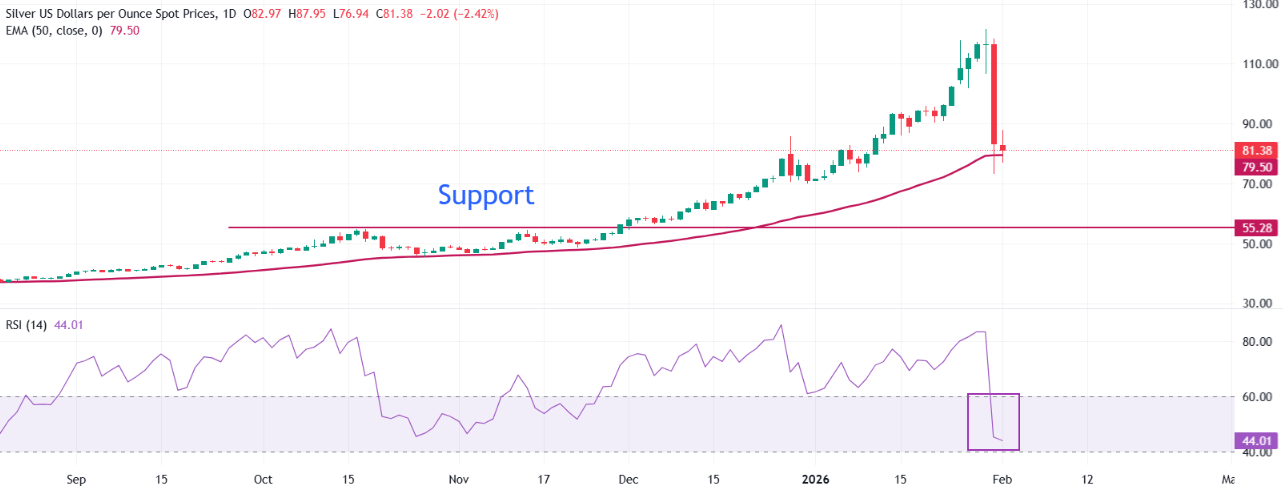 由于Warsh被提名担任新的美联储主席,美元走强,同时获利回吐导致银价惨跌。