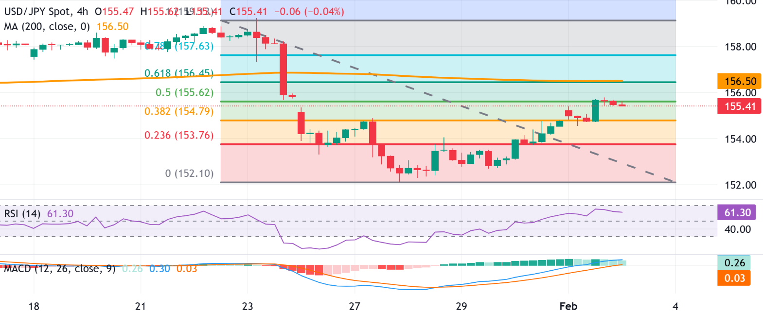 现货价格难以突破最近159.23-152.10下跌的50%回撤位。持续的上涨可能会将美元/日元汇率推高至156.45的交汇点——包括61.8%的斐波那契回撤位和4小时图上的200期简单移动平均线(SMA)。后者在156.50附近向下倾斜,保持整体趋势沉重。美元/日元汇率交易低于这一长期指标,任何复苏尝试都将在测试它时面临供应压力。