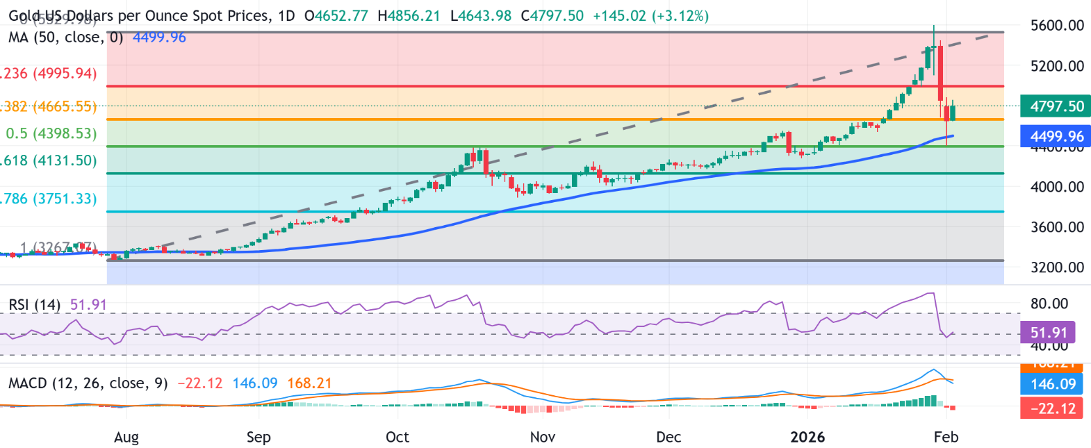 该商品在50天简单移动平均线(SMA)下方显示出韧性,并在周一从2025年7月到2026年1月的上涨的50%回撤位反弹。SMA的上升斜率表明可能会有支撑。此外,XAU/USD目前高于38.2%的斐波那契回撤位,约为4645-4650美元区域,应该提供附近的支撑。同时,相对强弱指数(RSI)位于51.91并逐步上升,表明有稳定的趋势。