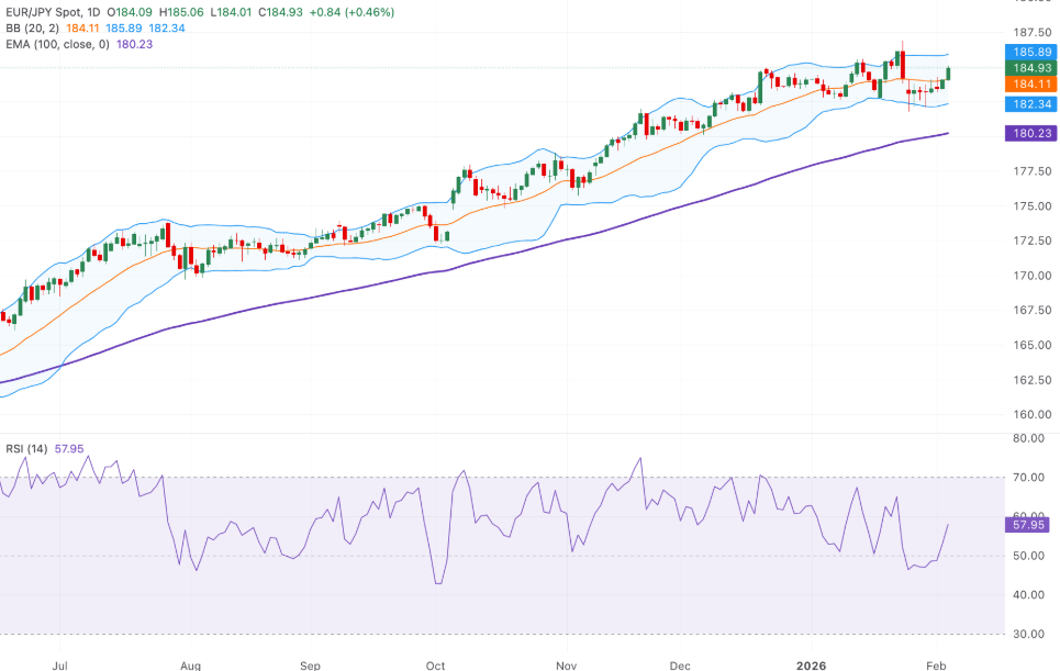 在周三的欧洲早盘,欧元/日元交叉盘在184.95附近吸引了些买家。日元(JPY)在面对欧元(EUR)的财政担忧背景下走弱。由于日本首相高市圣子的再通胀政策,市场预计在周日的突然大选前将会出现更高的波动性。