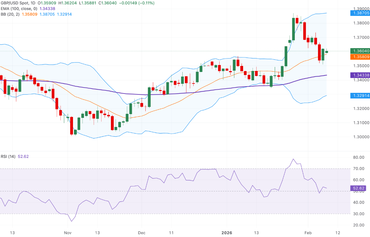 在日线图上,GBP/USD保持在100日指数移动平均线(EMA)上方,维持看涨趋势。在这一平均线之上,下跌时会找到支撑。布林带显示价格在中轨上方运行,且 envelopes(信封)在扩大,表明动量正在上升。RSI(52,中性)在50线上方稳定,保持温和的上涨趋势。