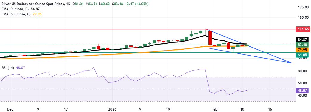 银 价格(XAG/USD)在前一天下跌后走强,周一欧洲早盘时段交易价格约为每盎司83.50美元。日线图表的技术分析表明,由于贵金属测试了下降楔形模式的上边界,可能会出现向上的反转。此外,14天相对强弱指数(RSI)为47(中性),有所上升,表明动力有所稳定。