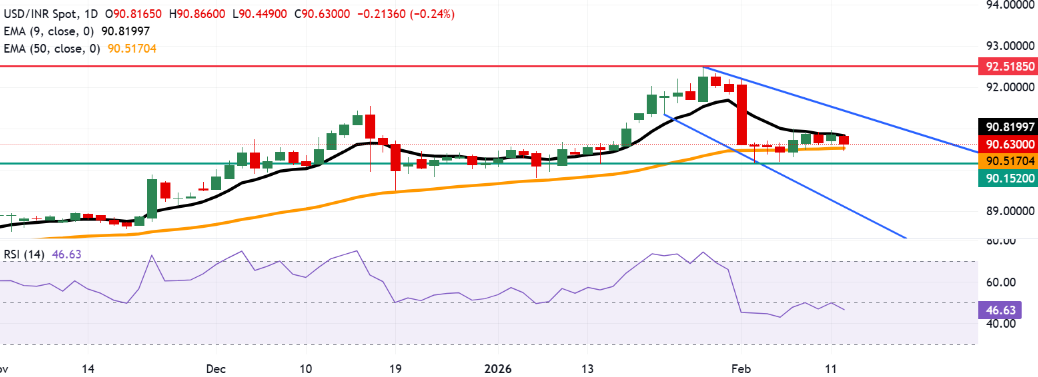 美元/印度卢比在90.50附近交易,此前从九日指数移动平均线(EMA)回撤