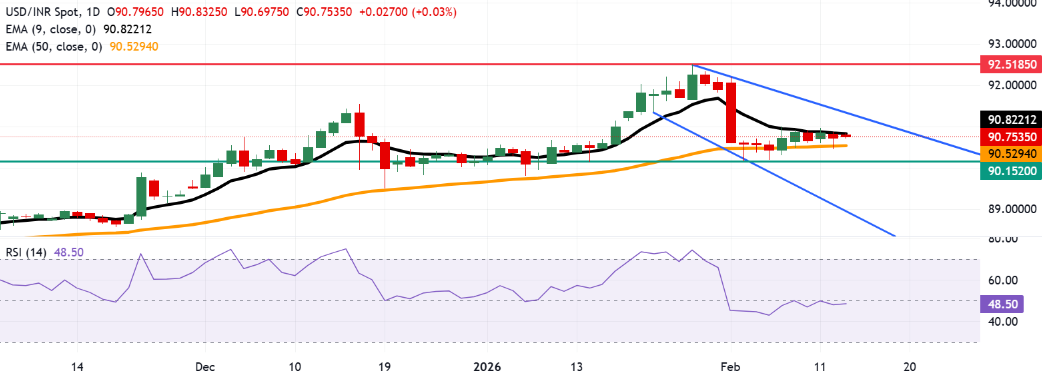 美元/印度卢比保持在接近91.00的九日指数移动平均线(EMA)下方