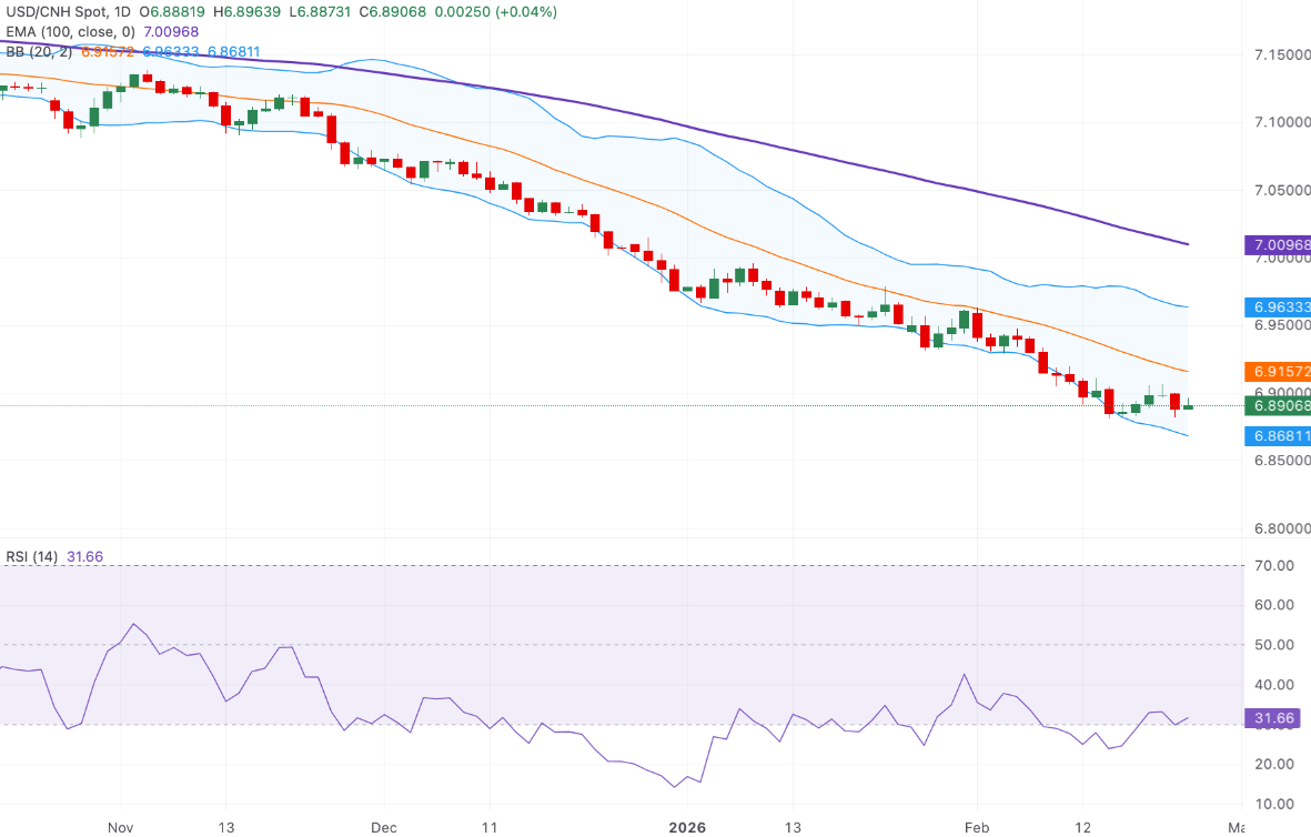 在日线图上,美元/人民币低于100日指数移动平均线,维持广泛的看跌趋势。20日布林线中轨滑落,限制了反弹,保持了短期的看跌情绪。14日相对强弱指数(RSI)为31.7,接近超卖水平,表明动力疲弱。