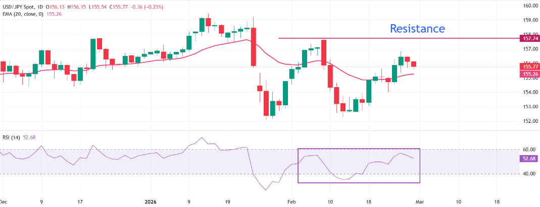 初始阻力出现在2月9日的157.66,位于上次上涨的159.20-159.45区间之前。下方, immediate 支撑在20日 EMA附近的155.20,其次是2月23日的低点154.00,然后是最近的摆动低点152.27,如果突破这个位置,将破坏当前的看涨结构,并开启更深的调整。
