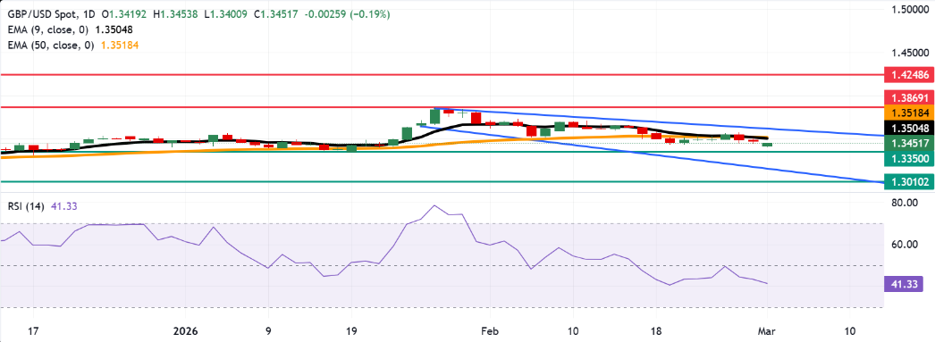 GBP/USD从日线损失中反弹,在周一的亚洲时段交易于1.3450附近。日线图的技术分析显示,由于该货币对在下降通道内交易,仍然存在看跌趋势。