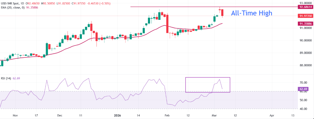 技术分析:美元/印度卢比从接近92.70的历史新高处调整回撤