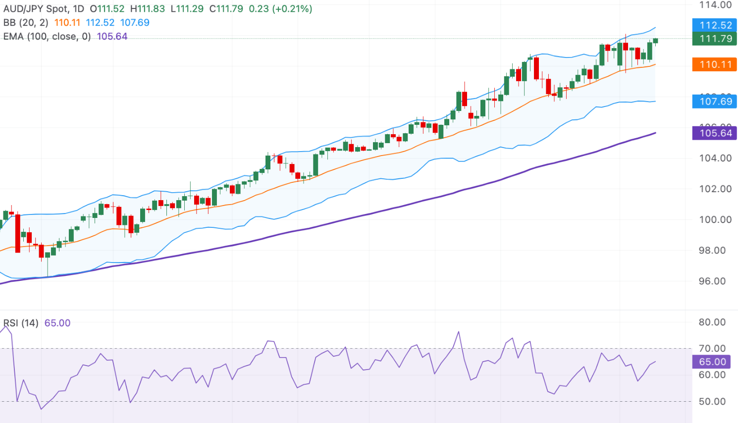 在日线图上,澳元/日元交易于111.79。由于价格大幅高于接近105.60的上升100日指数移动平均线,近期 bias 为看涨,确认了成熟的上升趋势而不是短期的上涨。现货价格坚定地高于约110.10的布林中轨,并接近112.50的上轨,这在扩展的波动背景下表明持续的上行压力。RSI 为65,位于看涨区域但低于超买极端值,表明有强劲的势头,并在出现疲劳信号之前还有进一步上涨的空间。