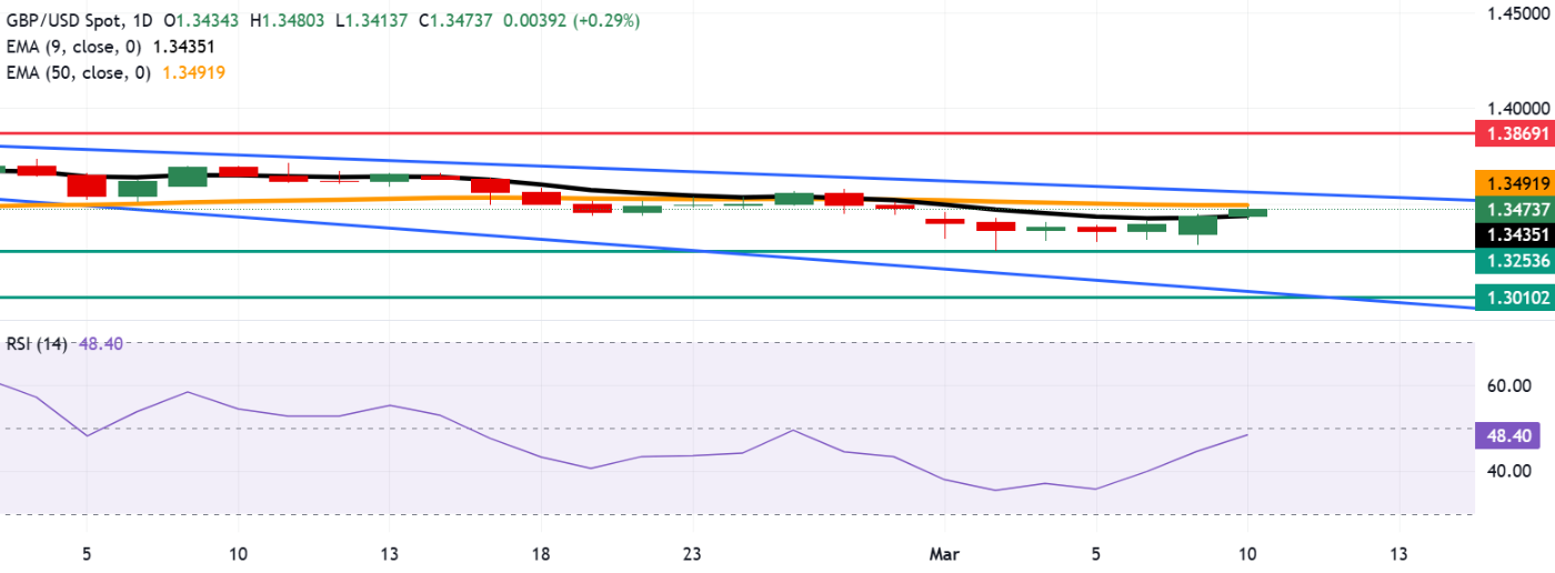 英镑/美元连续第三个交易日走高,在周二的欧洲早盘时段交易于1.3480附近。由于价格位于50日指数移动平均线(EMA)下方,但仍在更快的九日移动平均线之上,该货币对短期呈现温和的看跌趋势。九日移动平均线已转为走低,追踪了近期一系列的更低高点。