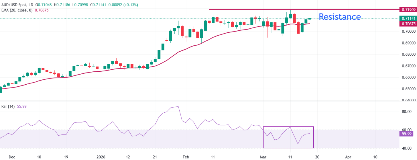 市场预期澳联储将收紧货币政策,因为伊朗冲突导致的油价上涨已引发全球通胀压力。然而,澳元走强的主要扳机似乎是行长米歇尔·布洛克证实,“在中东冲突之前,通胀就已经很高”,且“现金利率还不足以将通胀拉回目标水平”。