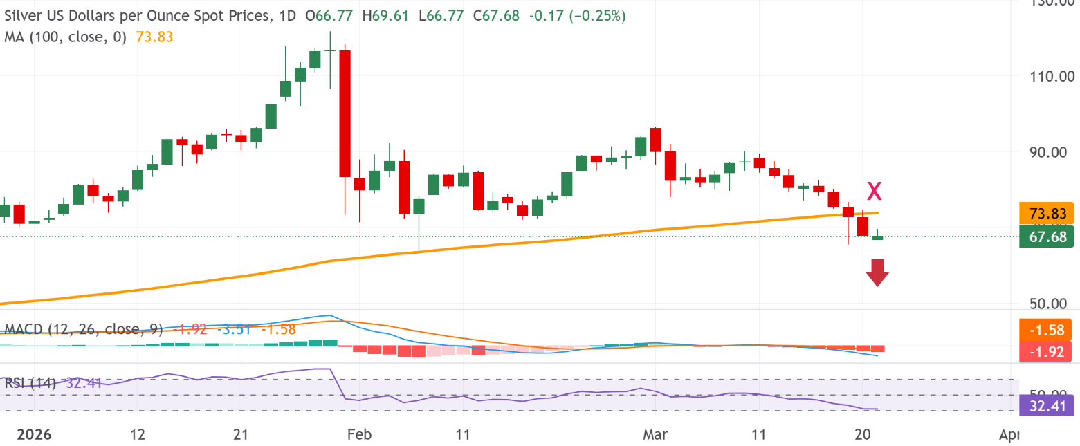 白银价格预测:白银/美元位于数周低点附近;若跌破 67.50 美元则显得脆弱