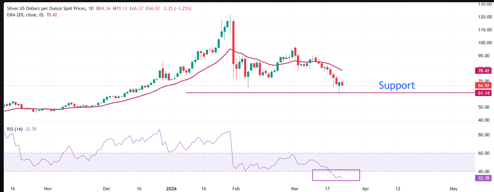 XAG/USD 在发稿时交易价格约为66.40美元。由于现货价格远低于20日指数移动平均线(EMA),且该均线目前追踪在78.40美元附近并限制了反弹尝试,短期走势偏向看跌。价格已跌破一系列较高的日收盘价,并远离20日EMA,进一步强化了下行压力。