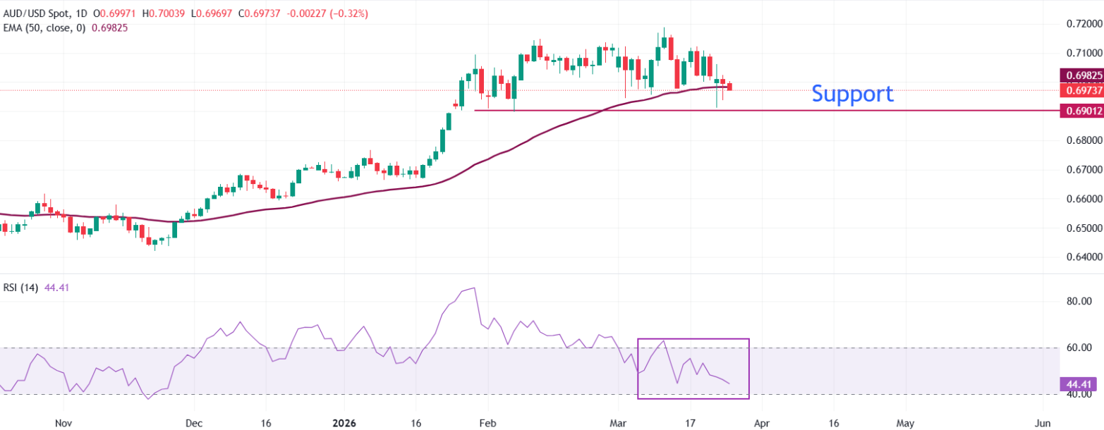 澳元/美元在周三的亚洲交易时段跌至接近0.6975。由于现货价格主要在50日指数移动平均线(EMA)附近波动,短期走势偏向中性至看跌,该均线在之前引导上涨后,目前已在0.70下方趋于平缓。