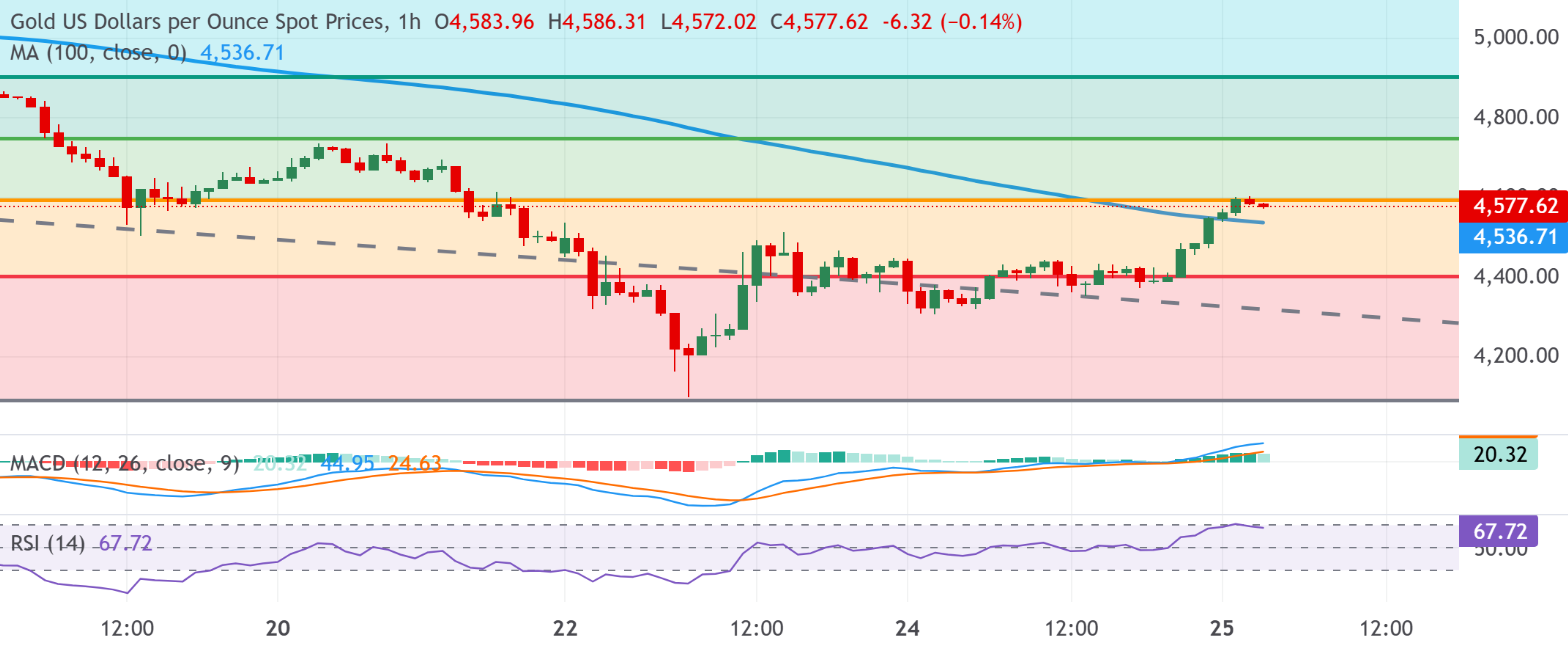 跌破4401美元将削弱当前的看涨倾向,并暴露向4250-4300美元区域的更深度回调,而守住这些支撑位则能维持日内上涨趋势。