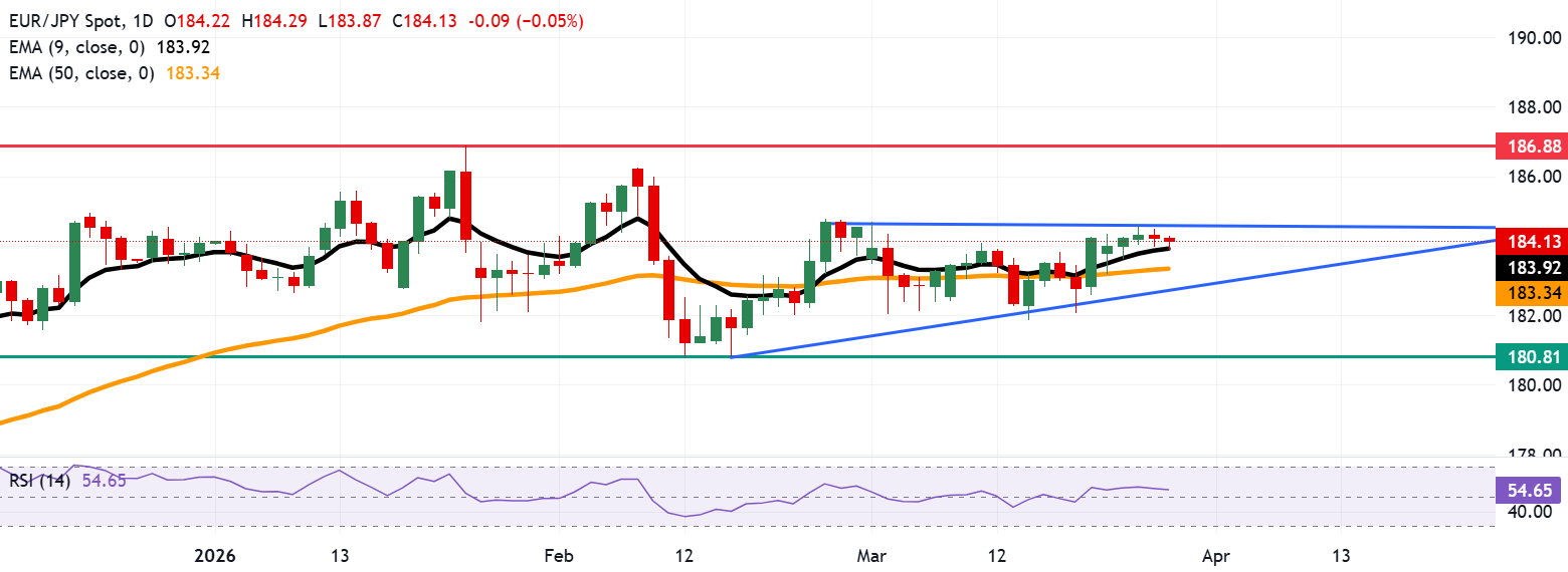 欧元/日元连续第二个交易日下跌,周五亚洲时段交投于184.10附近。日线图技术分析显示,该货币对仍接近上升三角形形态的上轨,反映出买盘压力上升,或将引发向上突破。
