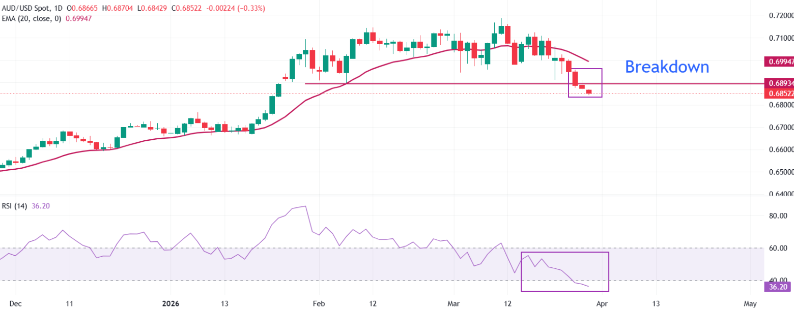 澳元/美元暴跌至接近0.6850,因澳元在避险情绪下表现不佳。