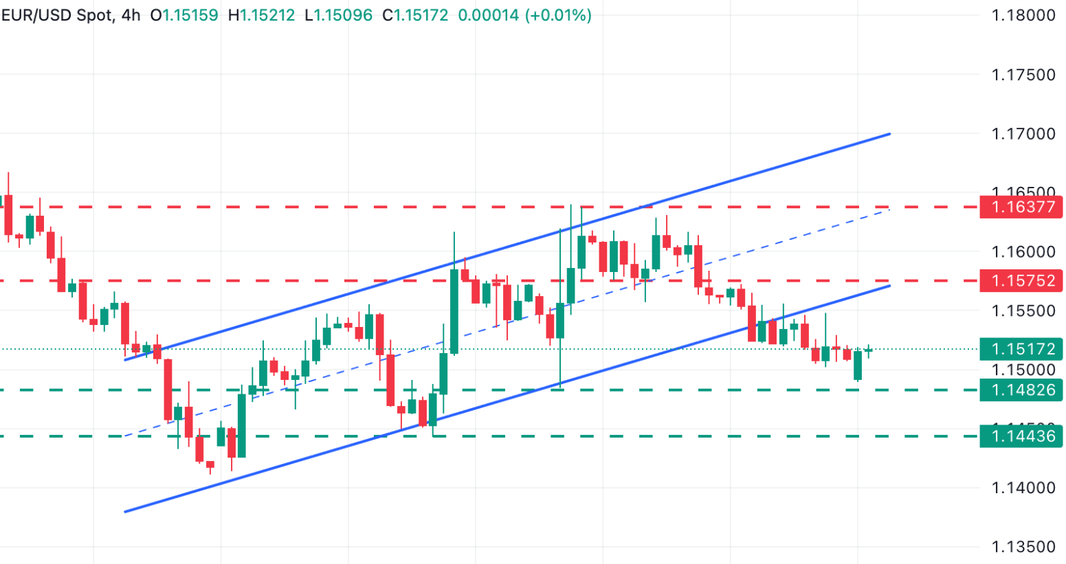 欧元兑美元汇率报1.1517,上周跌破上升通道下轨后,短期走势略偏空。4小时图MACD指标柱线转为负值,快线位于信号线下方且两者均低于零轴,强化了下行动能;RSI指标在43附近,仍低于50中线,表明空头占据主导,但尚未出现超卖状况。