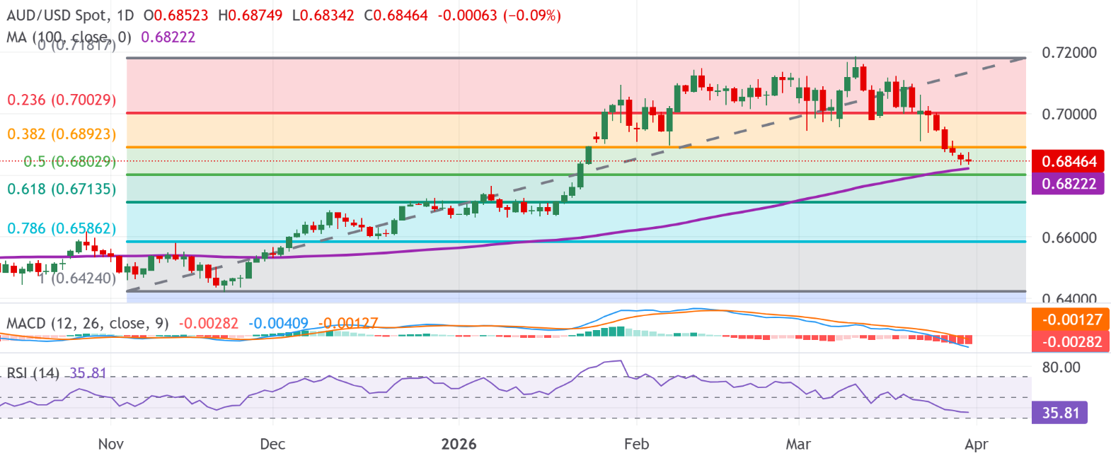 从技术面来看,现货价格在上升中的100日简单移动平均线(SMA)附近即0.6820区域获得一定支撑,这缓解了下行压力。然而,移动平均收敛发散指标(MACD)仍位于信号线下方处于负值区域,同时相对强弱指数(RSI)滑落至36附近,这些信号都表明看涨动能正在消退,并预示着修正压力可能进一步加大。
