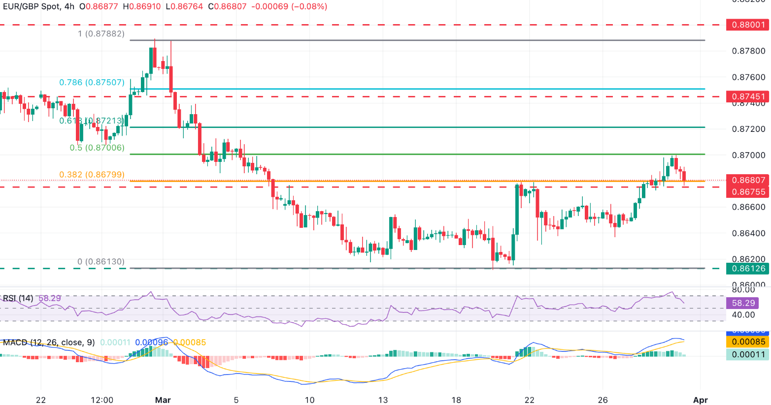 EUR/GBP目前交易价为0.8689,4小时图技术指标显示短期内呈现温和看涨态势。相对强弱指数(RSI)已从超买区域回落,但仍保持在50线上方,表明当前正向动能正在降温而非逆转。移动平均收敛发散指标(MACD)线略高于信号线且刚突破零轴,这既支撑了上行压力的延续,也提示当前动能并不强劲。