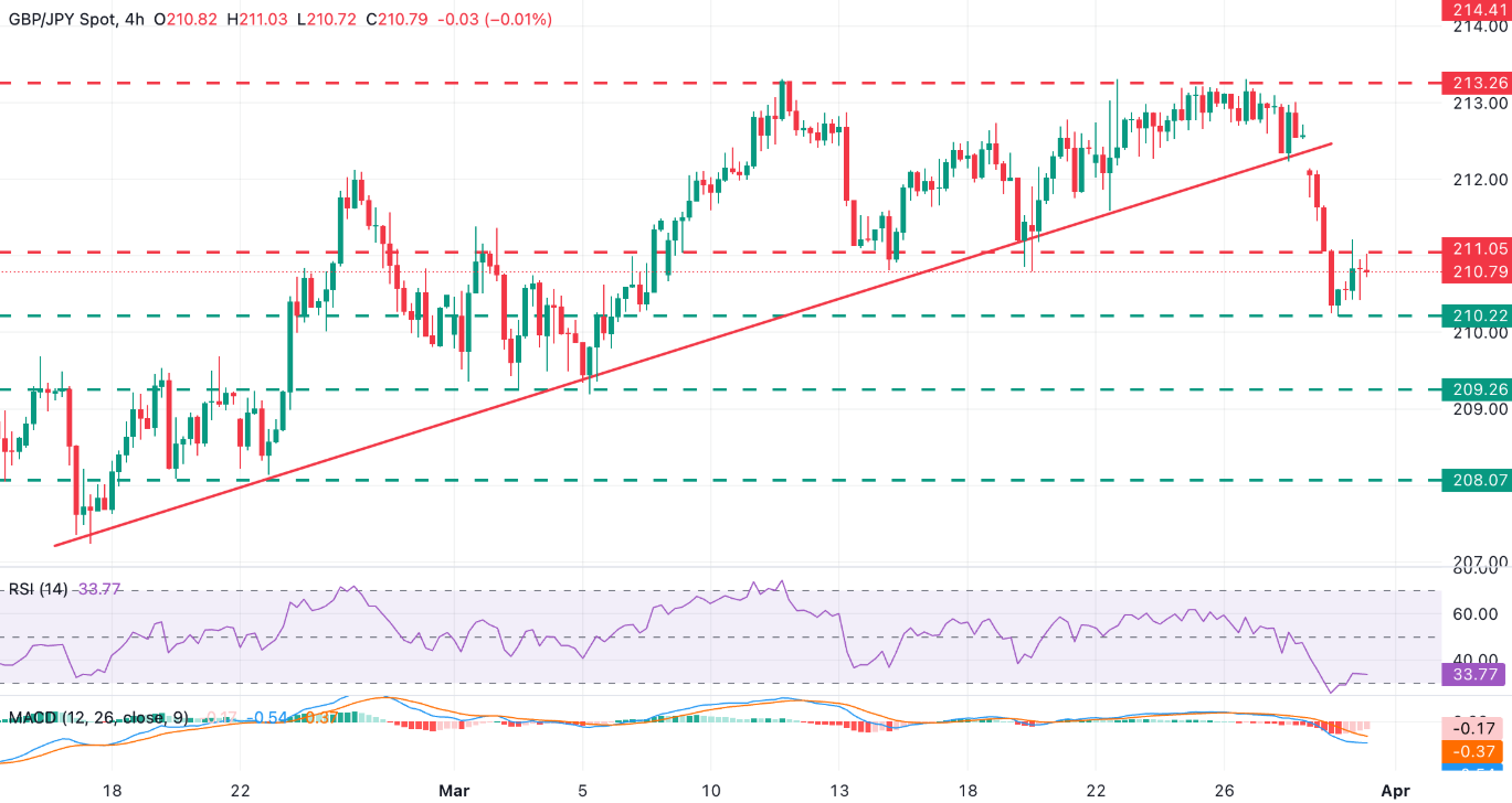 英镑/日元交易于210.79,周一近1%的抛售后短期倾向仍偏空。4小时相对强弱指数(RSI)从接近25的超卖区域回升后保持在中位区间,暗示下行动能减弱而非明确反转。平滑异同移动平均线(MACD)仍位于零轴下方,突显空头动能。
