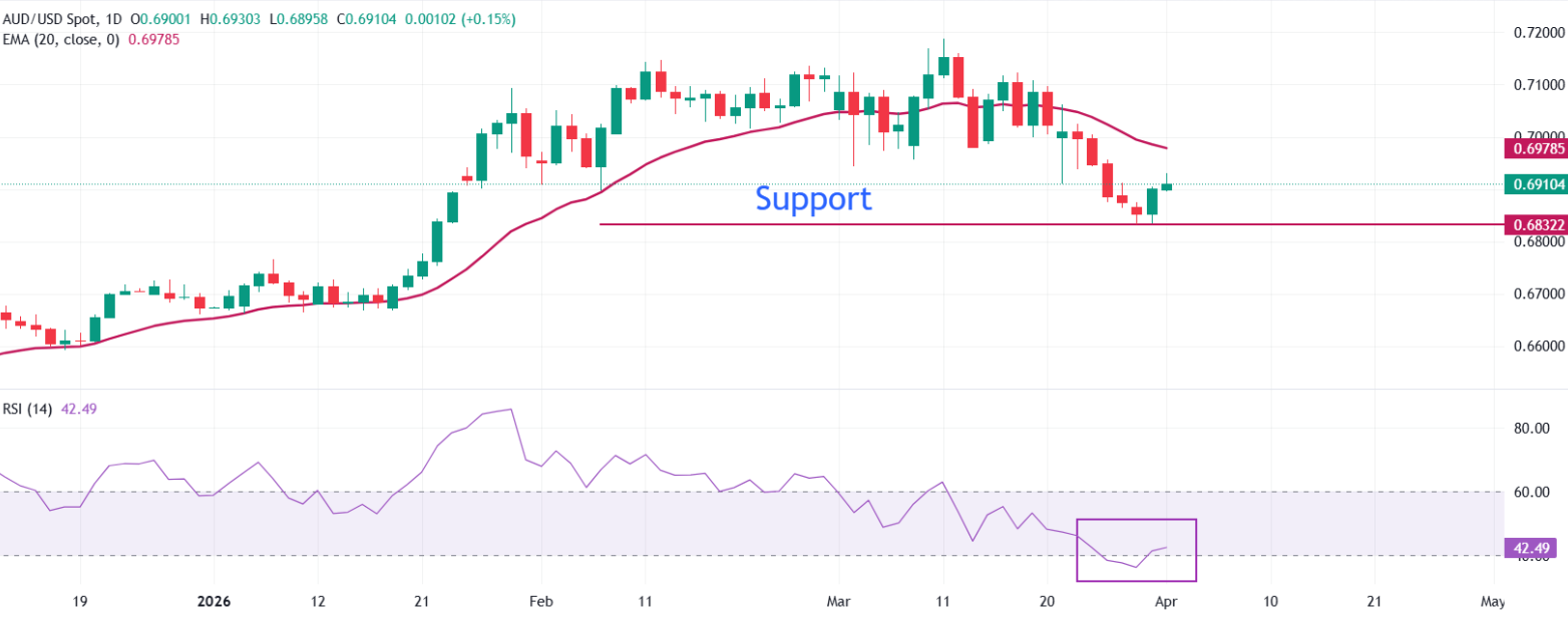 澳元/美元货币对回吐部分早盘涨幅,但在周三亚洲交易时段尾盘仍上涨0.12%至0.6910附近。澳元延续周二的反弹走势,因美国和伊朗双方表态愿意结束战争,增强了市场对中东停火的希望。