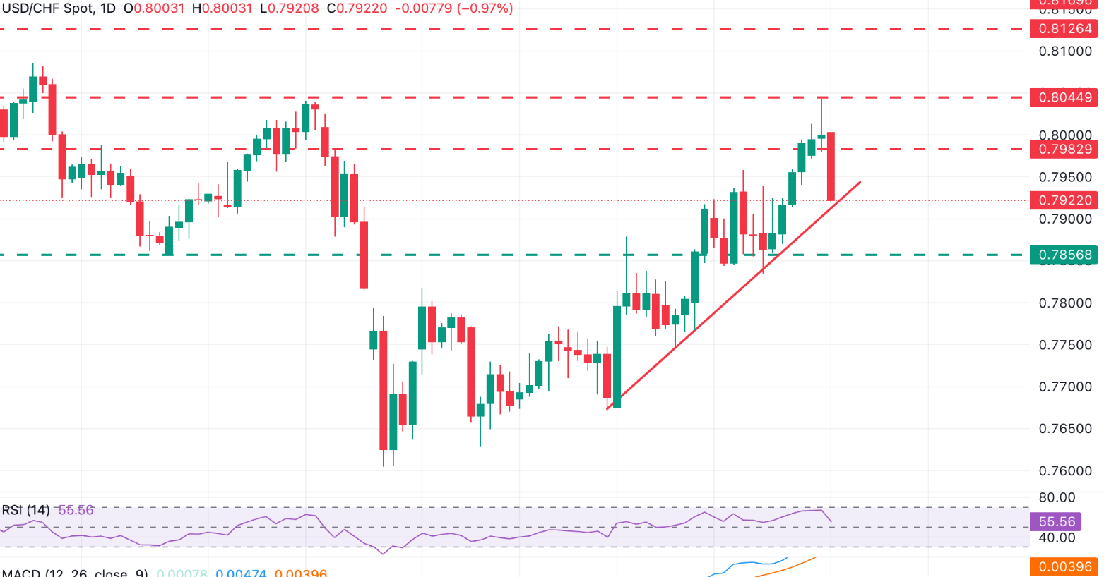 美元/瑞郎价格预测:日线图显示,该货币对在0.8000中段关键阻力位出现脉冲式反转