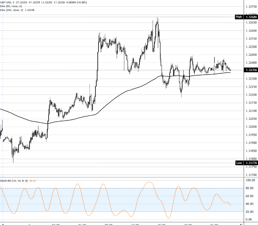 在5分钟图上,英镑/美元交易于1.3236。由于价格稳定维持在200周期均线1.3233上方缓慢攀升,短期倾向温和看涨,尽管区间狭窄但仍支撑日内趋势。随机相对强弱指数最新读数在未能延续早前突破70区域后回落至刻度下半区,显示上行动能正在减弱,但只要汇价保持在长期日内均线上方,就不构成直接看跌反转。