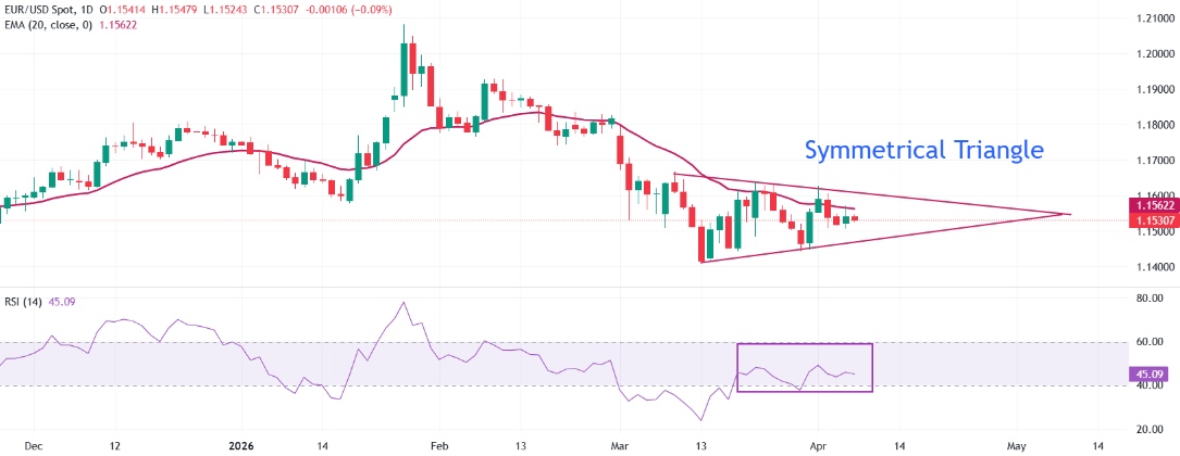 周二开盘交易中,欧元兑美元小幅下跌至接近1.1530。价格略低于20日指数移动平均线(EMA)附近的1.1560,由于该货币对难以收复这一动态阻力位,短期走势仍偏空。
