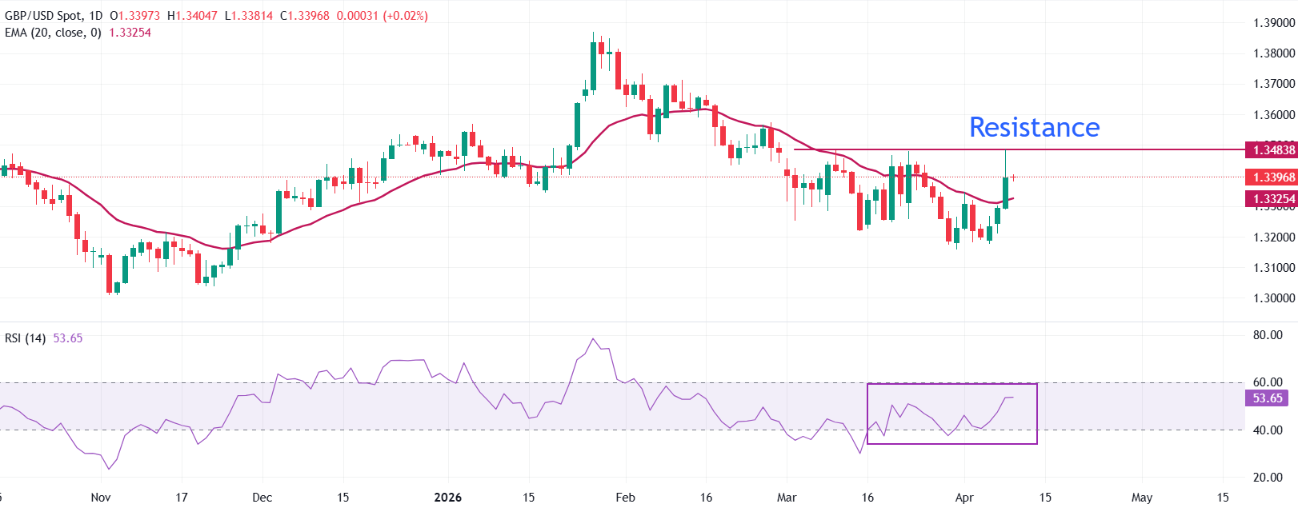 GBP/USD 在周四亚洲时段于 1.3400 附近横向波动。该货币对保持温和看涨倾向,因现价仍位于 20 日指数移动平均线(EMA)1.3325 之上,暗示下行尝试将在该动态支撑位附近被吸收。