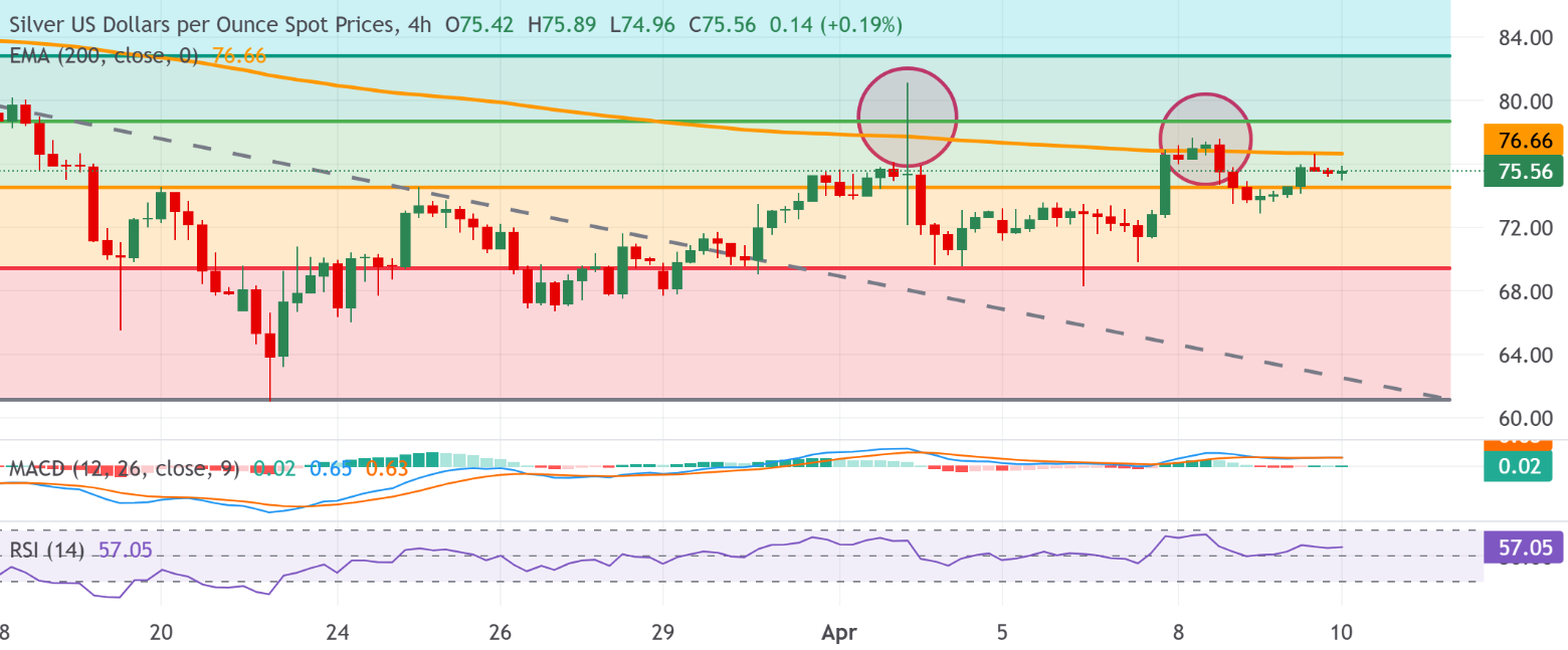 白银价格预测:白银/美元在 75.00 美元中位数下方盘整;H4 图表上的 200 日均线是关键