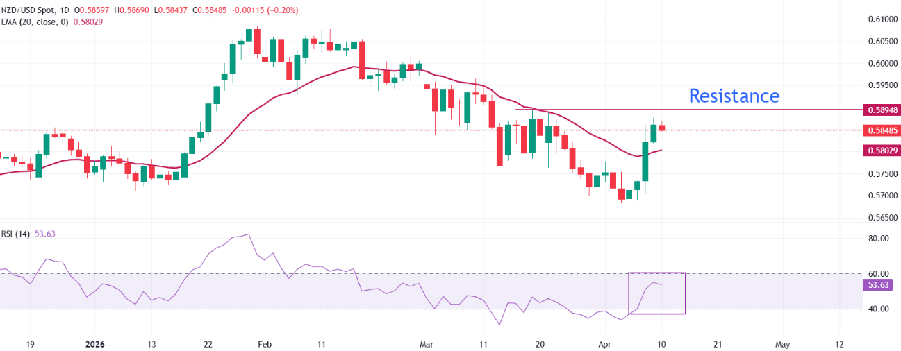 NZD/USD货币对在连续四天上涨后出现回调,周五欧洲早盘交易时段下跌0.25%至0.5845附近。由于投资者在美国与伊朗就德黑兰提出的10点和平提案(考虑永久停火)进行谈判前转为谨慎,新西兰元货币对面临轻微抛售压力。