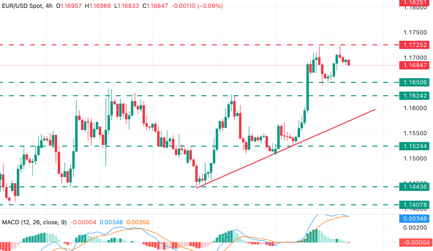 该货币对在1.1720区域显示出潜在的双重顶形态,4小时相对强弱指数(RSI)显示看跌背离,且同一时间框架内的移动平均收敛散度(MACD)即将下穿信号线。