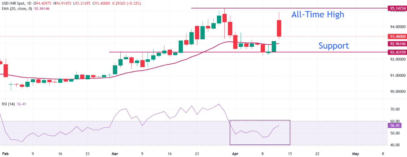印度卢比(INR)在本周初开盘交易中对美元(USD)大幅下跌。%% USD/INR%% 货币对因美国海军奉唐纳德·特朗普总统之命宣布完全封锁霍尔木兹海峡而上涨至接近93.35,该海峡是全球近20%能源供应的通道,油价因此上涨,给印度卢比带来了沉重压力。