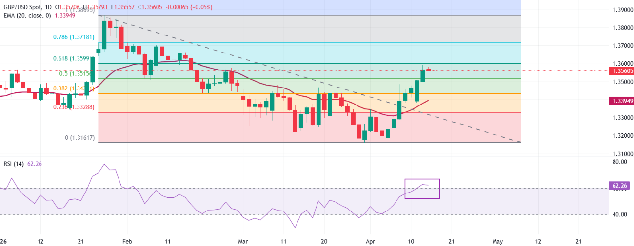 截至发稿时,GBP/USD 在 1.356 附近交易,走势强劲,维持看涨倾向,同时保持在 20 周期指数移动平均线(EMA)1.3395 和中位数 50% 之上。斐波那契回撤位 1.3516。